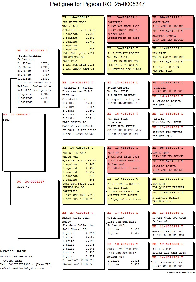 Pentru a-și întări linia competițională, familia Radu a achiziționat pui de la campionii naționali belgieni specializați în viteza, porumbei ce au contribuit semnificativ la succesul echipei.