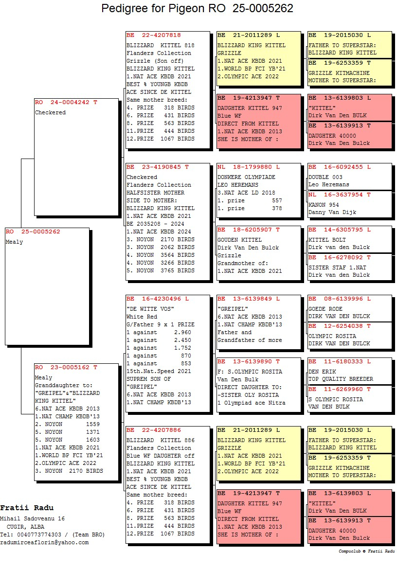 Pentru a-și întări linia competițională, familia Radu a achiziționat pui de la campionii naționali belgieni specializați în viteza, porumbei ce au contribuit semnificativ la succesul echipei.