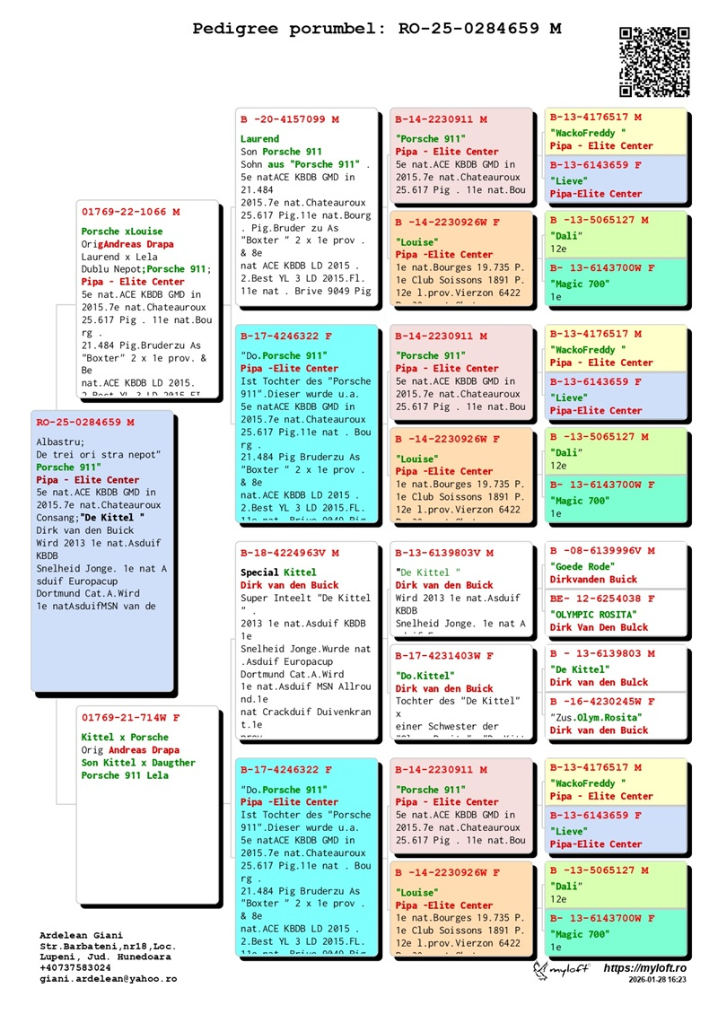 În prezent, domnul Ardelean scoate la vânzare un grup de 12 porumbei cu origini de elită, destinați să ducă mai departe tradiția succesului. Rezultatele obținute de crescători care au introdus acești porumbei în loturile lor confirmă valoarea lor genetică: