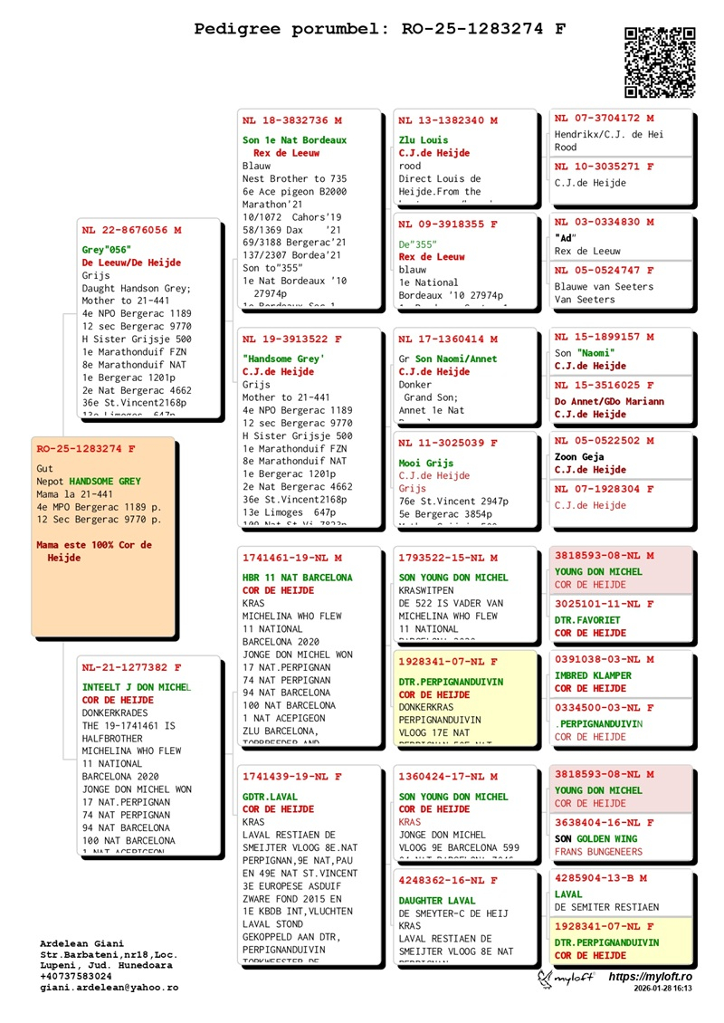 În prezent, domnul Ardelean scoate la vânzare un grup de 12 porumbei cu origini de elită, destinați să ducă mai departe tradiția succesului. Rezultatele obținute de crescători care au introdus acești porumbei în loturile lor confirmă valoarea lor genetică: