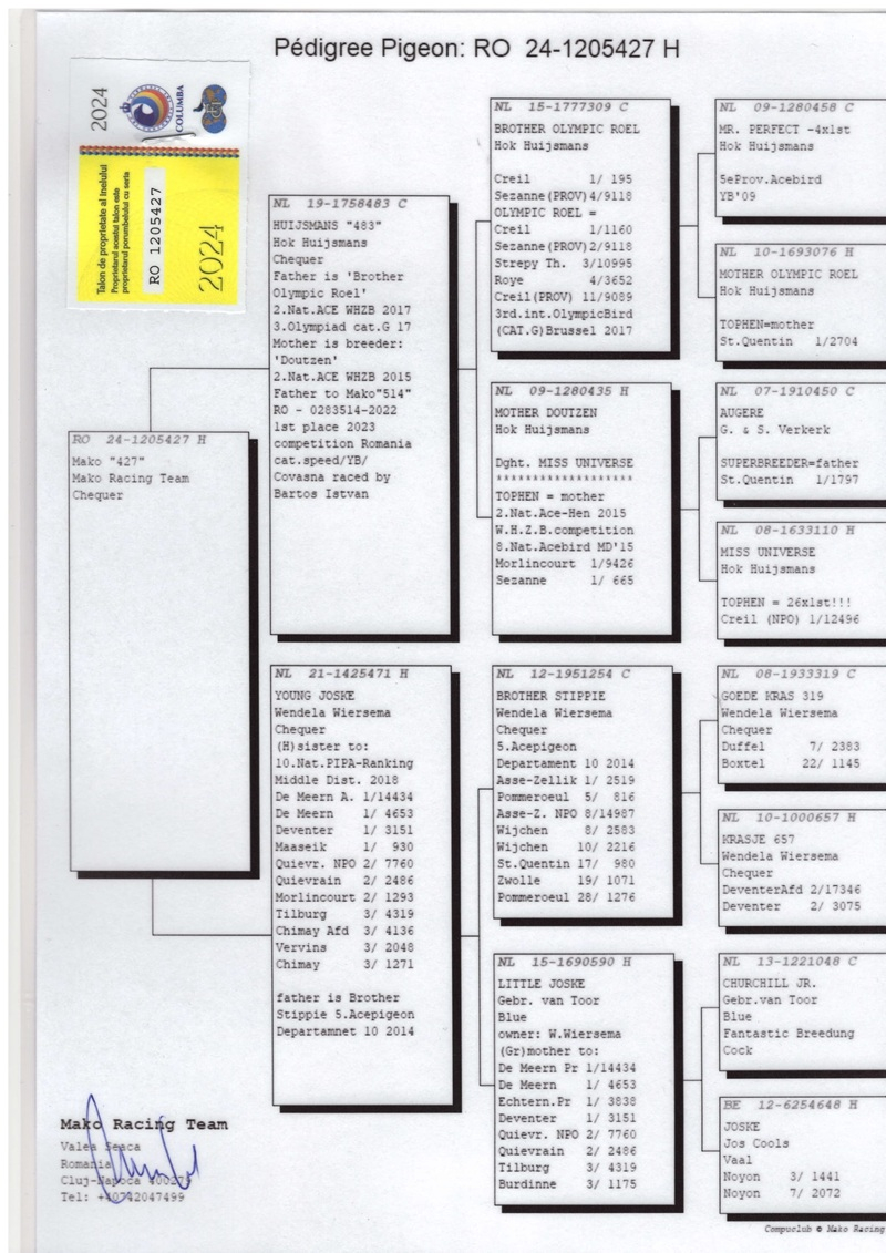 • Locul 1 la Hot Spot 115 km și locul 1 la Derby Extra Finala 500 km, cu același porumbel;