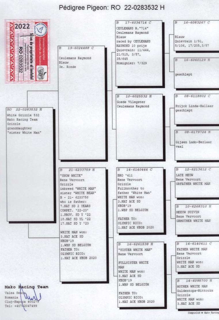 • Locul 1 la Hot Spot 115 km și locul 1 la Derby Extra Finala 500 km, cu același porumbel;