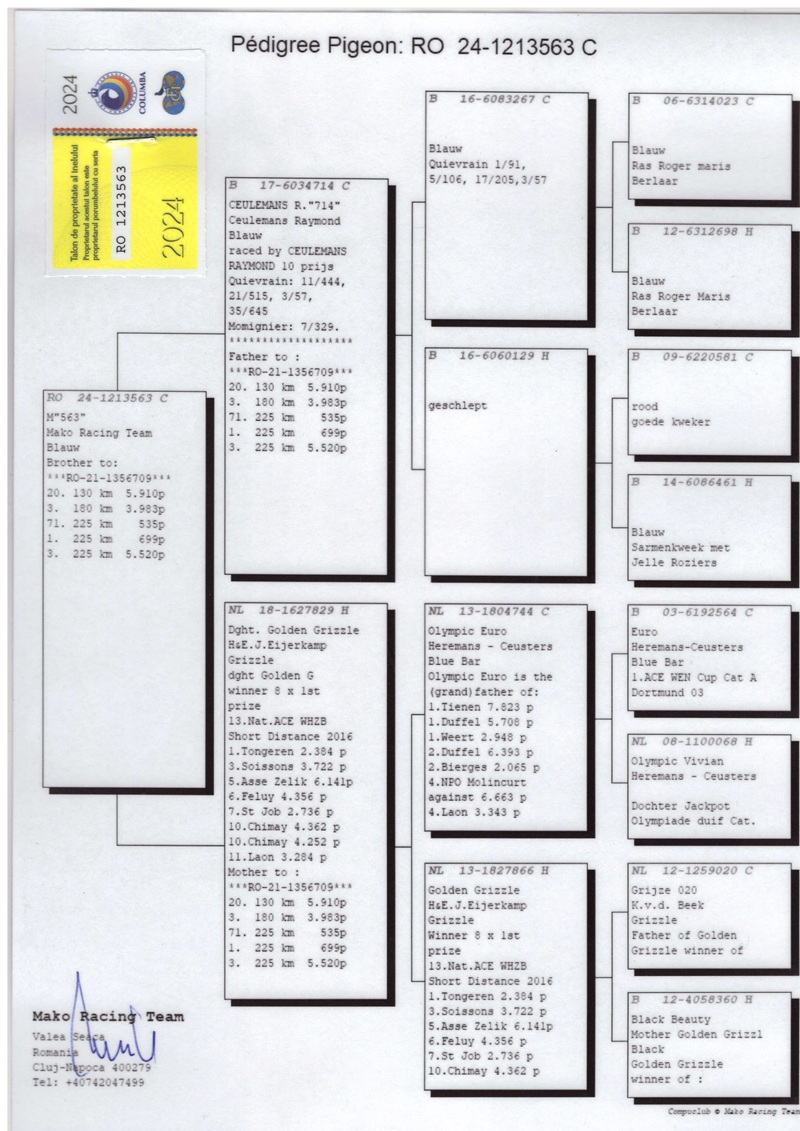 • Locul 1 la Hot Spot 115 km și locul 1 la Derby Extra Finala 500 km, cu același porumbel;