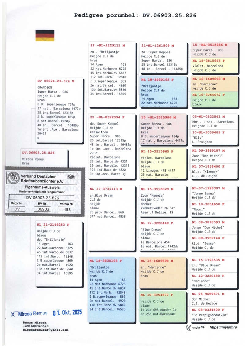 Selecția păsărilor a fost realizată cu rigoare, fiecare exemplar fiind ales pentru pedigree-ul său valoros și palmaresul de excepție. Printre aceste linii remarcabile se regăsesc descendenți ai unor porumbei legendari precum „Jonge Don Michel”„Marianne”„Diamantje”„Smaragd”„Milos”„Miss Milos” și „de Kleine Blauwe”. Împreună, acești porumbei constituie una dintre cele mai solide baze de reproducție ale unui crescător român stabilit în afara granițelor țării.