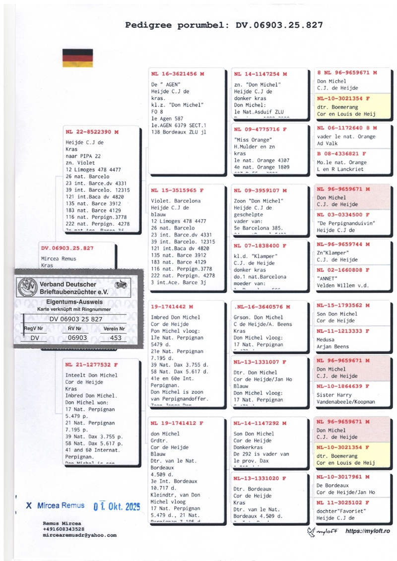 Selecția păsărilor a fost realizată cu rigoare, fiecare exemplar fiind ales pentru pedigree-ul său valoros și palmaresul de excepție. Printre aceste linii remarcabile se regăsesc descendenți ai unor porumbei legendari precum „Jonge Don Michel”„Marianne”„Diamantje”„Smaragd”„Milos”„Miss Milos” și „de Kleine Blauwe”. Împreună, acești porumbei constituie una dintre cele mai solide baze de reproducție ale unui crescător român stabilit în afara granițelor țării.