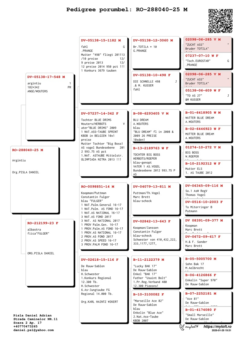 În cadrul acestei licitații, Pîslă Daniel pune la dispoziție un lot exclusiv de porumbei proveniți direct din descendența campionilor săi consacrați. Aceste exemplare valoroase reprezintă moștenirea genetică a celor mai prestigioși câștigători care i-au adus renumele de-a lungul anilor, transformându-l într-un veritabil „colecționar” de trofee. Participarea la această licitație oferă o ocazie rară de a achiziționa porumbei de excepție, cu un pedigree remarcabil, ce poartă amprenta măiestriei și a viziunii columbofilului Pîslă Daniel.