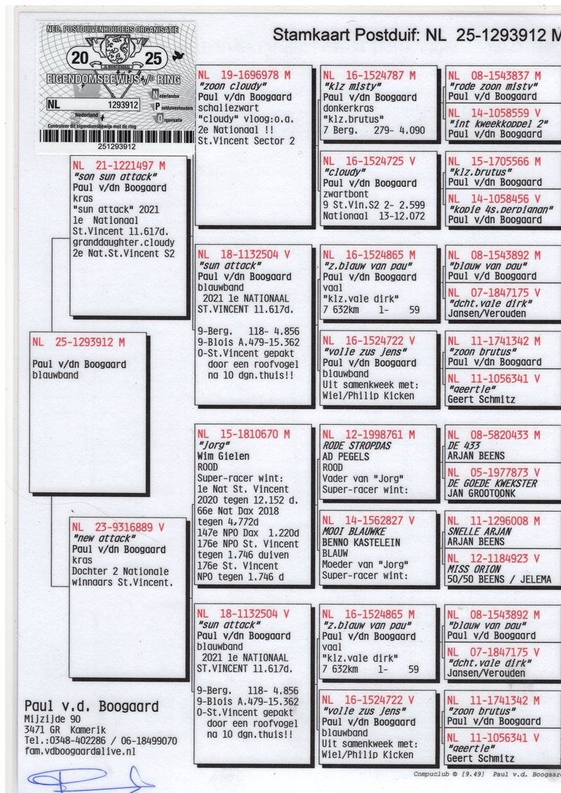 De-a lungul anilor, Paul a construit cu răbdare și viziune o rasă excepțională de porumbei, bazată pe calitate pură și performanță dovedită. Printre porumbeii fundamentali ai crescătoriei sale se regăsesc legendarii Brutus și Misty, două exemplare de referință care au consolidat decisiv forța genetică a coloniei. În toți porumbeii de bază ai crescătoriei se regăsesc constant perechile de reproducere 1 și 2, pilonii principali ai acestei linii de elită. Prin introduceri atent selecționate de sânge nou, Paul a știut întotdeauna să ofere coloniei impulsuri strategice, fără a-i afecta identitatea genetică.