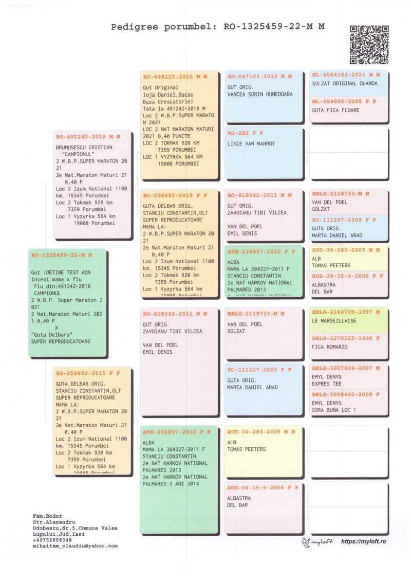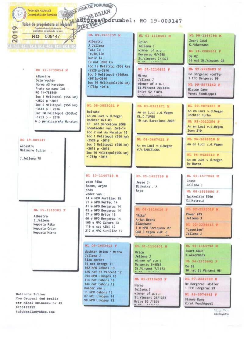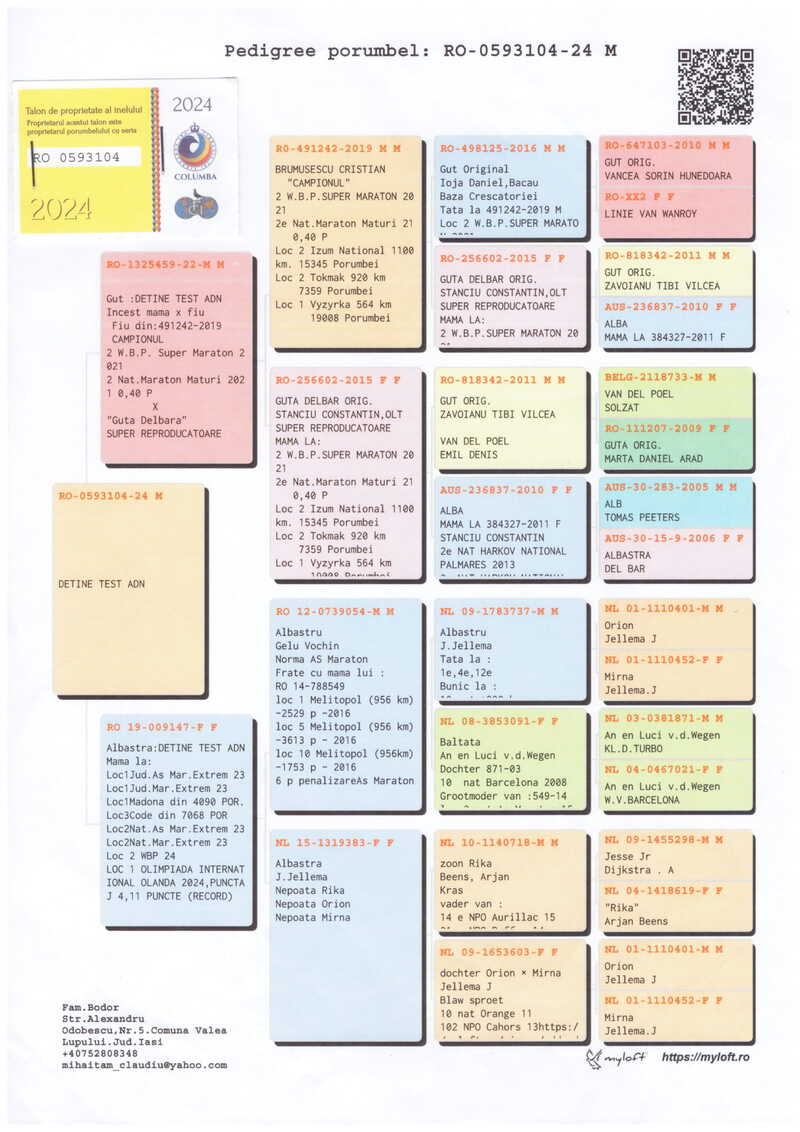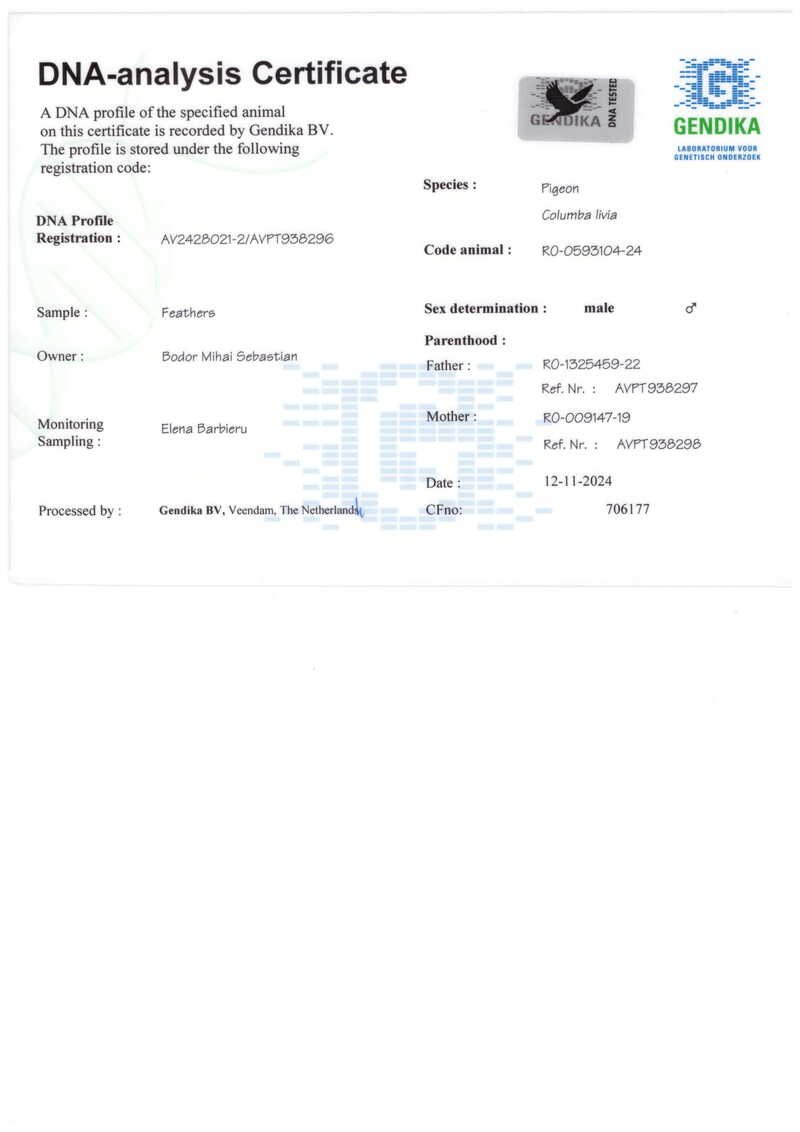 În volierele sale se regăsesc porumbei proveniți din linii de elită, achiziționați de la crescători consacrați din România și din străinătate, atât din cadrul Uniunii Columbofile Profesioniste din România (UCPR), cât și al Federației Naționale a Columbofililor din România (FNCPR). Materialul genetic valoros provine de la nume de prestigiu precum Cristea Sorin, Deftu Robert, Cazacu Alexandru, Botnar Ștefan, Vochin George, Tănase Ionuț, Vartolomei Florin, Melinche Iulian, Chelaru Cristinel, Bogdan Sorin, Fr. Ungureanu, Moldovan Teofil Ioan, Cătălin Antofie, Postelnicu Mihai, precum și de la crescători internaționali de renume, între care se remarcă Familia Bodor din România, laureată a olimpiadelor columbofile.