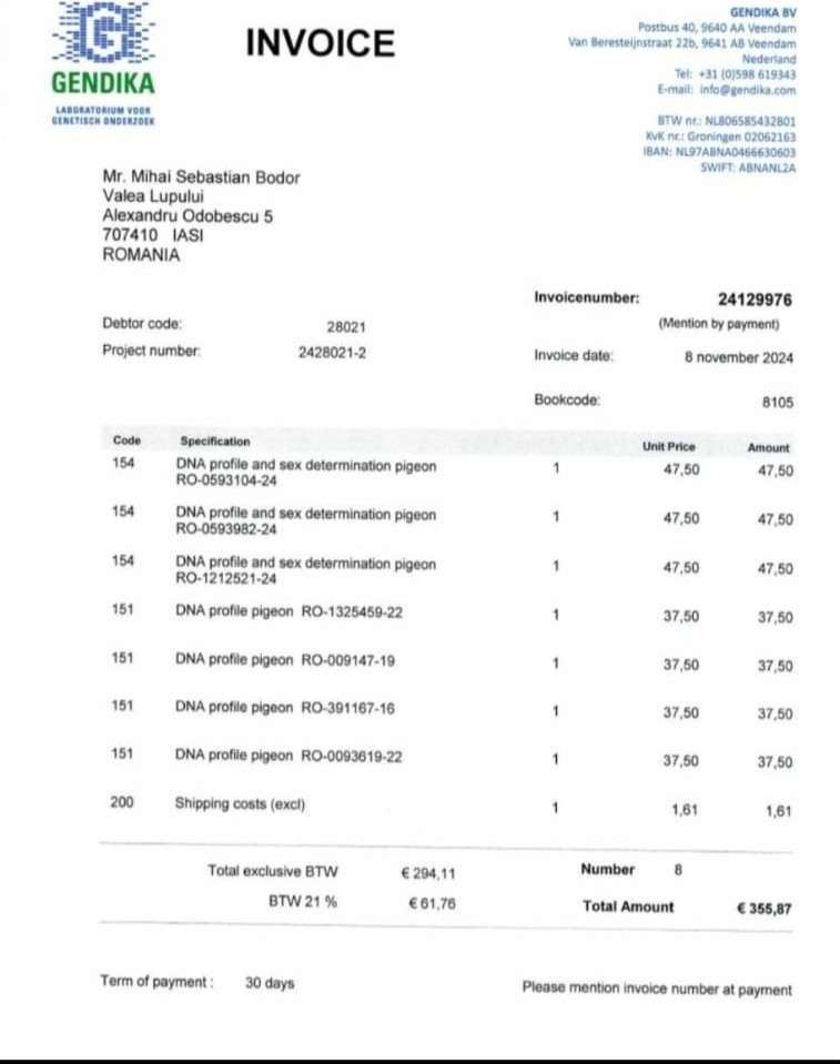 Livrarea porumbeilor se va efectua doar după achitarea integrală a sumei în contul bancar specificat mai jos: