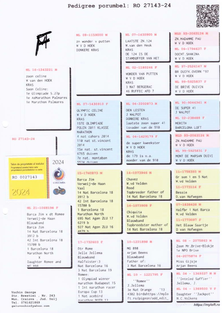 În volierele sale se regăsesc porumbei proveniți din linii de elită, achiziționați de la crescători consacrați din România și din străinătate, atât din cadrul Uniunii Columbofile Profesioniste din România (UCPR), cât și al Federației Naționale a Columbofililor din România (FNCPR). Materialul genetic valoros provine de la nume de prestigiu precum Cristea Sorin, Deftu Robert, Cazacu Alexandru, Botnar Ștefan, Vochin George, Tănase Ionuț, Vartolomei Florin, Melinche Iulian, Chelaru Cristinel, Bogdan Sorin, Fr. Ungureanu, Moldovan Teofil Ioan, Cătălin Antofie, Postelnicu Mihai, precum și de la crescători internaționali de renume, între care se remarcă Familia Bodor din România, laureată a olimpiadelor columbofile.