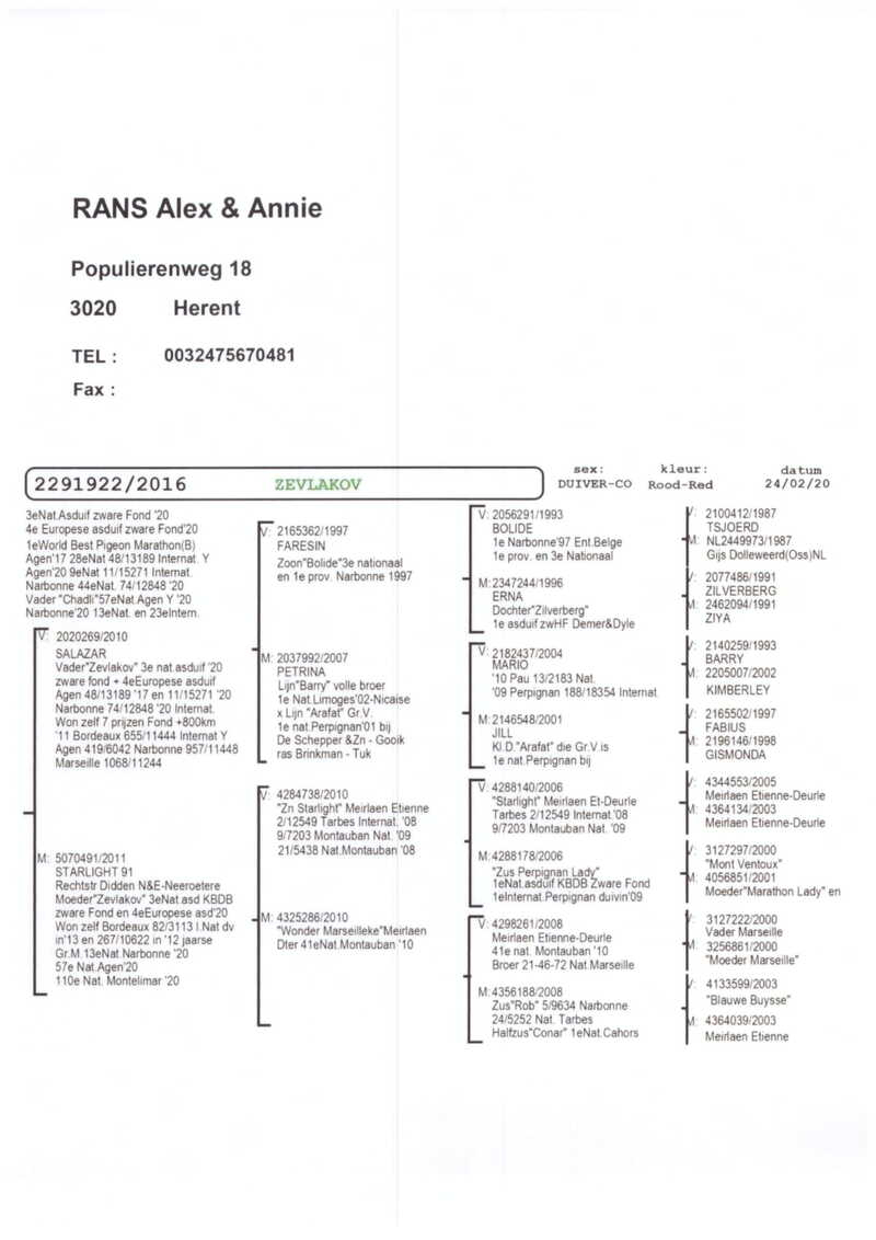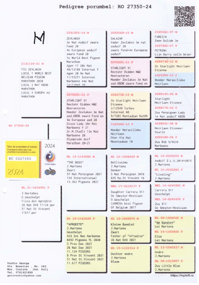 În volierele sale se regăsesc porumbei proveniți din linii de elită, achiziționați de la crescători consacrați din România și din străinătate, atât din cadrul Uniunii Columbofile Profesioniste din România (UCPR), cât și al Federației Naționale a Columbofililor din România (FNCPR). Materialul genetic valoros provine de la nume de prestigiu precum Cristea Sorin, Deftu Robert, Cazacu Alexandru, Botnar Ștefan, Vochin George, Tănase Ionuț, Vartolomei Florin, Melinche Iulian, Chelaru Cristinel, Bogdan Sorin, Fr. Ungureanu, Moldovan Teofil Ioan, Cătălin Antofie, Postelnicu Mihai, precum și de la crescători internaționali de renume, între care se remarcă Familia Bodor din România, laureată a olimpiadelor columbofile.