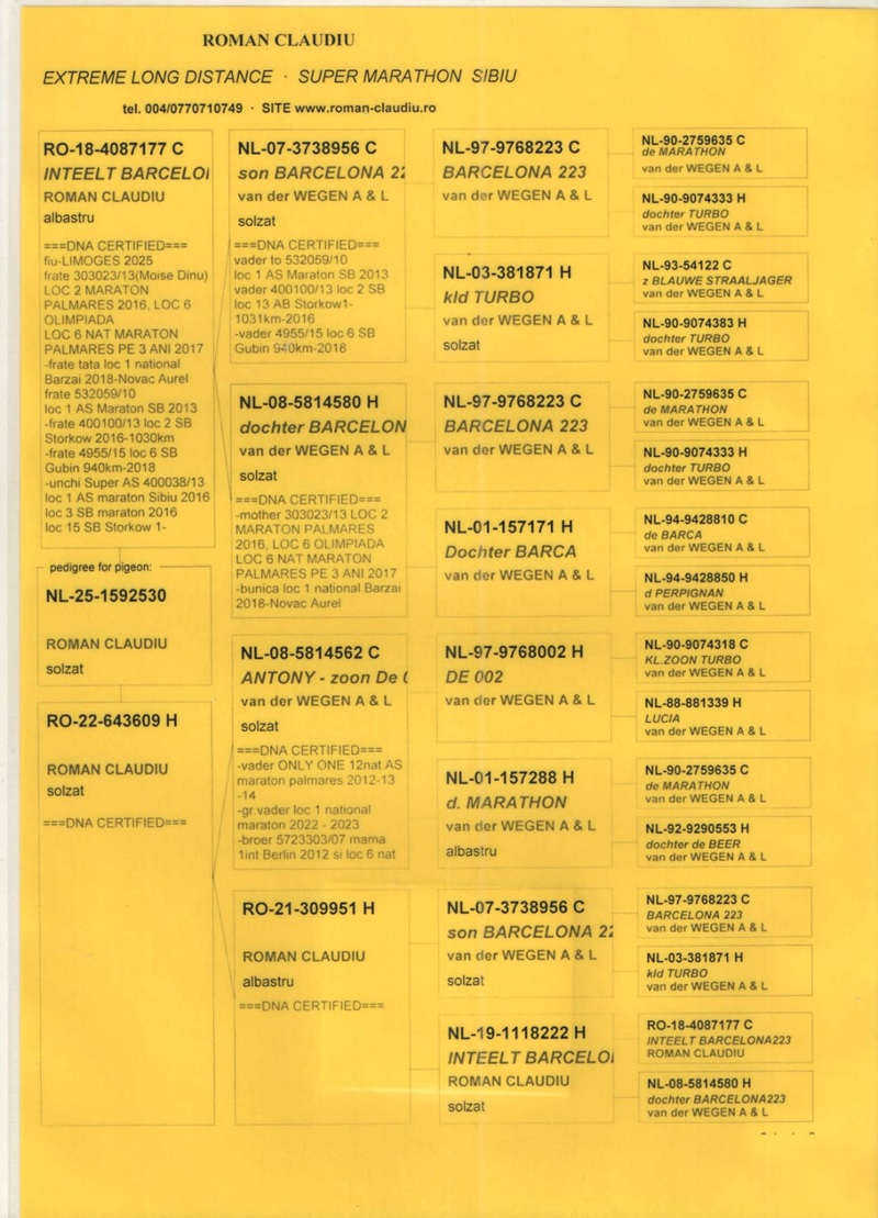 Acești porumbei descind din linii consacrateVan der Wegen, De Heijde, Hagens și Belleter – linii formate din păsări cu performanțe dovedite, atent selecționate, testate în zbor și pregătite pentru maratoanele de elită ale sezoanelor viitoare (Bordeaux 2025, Barcelona 2026).