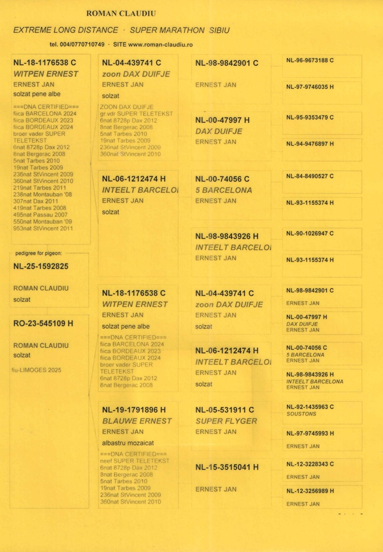 Acești porumbei descind din linii consacrate – Van der Wegen, De Heijde, Hagens și Belleter – linii formate din păsări cu performanțe dovedite, atent selecționate, testate în zbor și pregătite pentru maratoanele de elită ale sezoanelor viitoare (Bordeaux 2025Barcelona 2026).