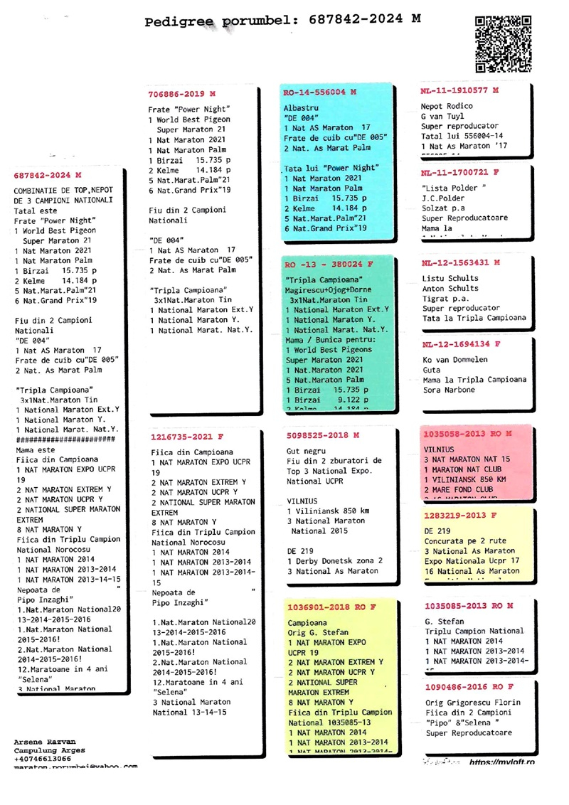 Fiecare porumbel prezentat este rezultatul unei selecții exigente și al unei munci constante, bazate pe perseverență, disciplină și o viziune clară asupra performanței sportive. Exemplarele provin din linii de elită, recunoscute pentru rezistență, orientare precisă și constanță la distanțe mari, trăsături care definesc veritabilii competitori ai marilor curse.