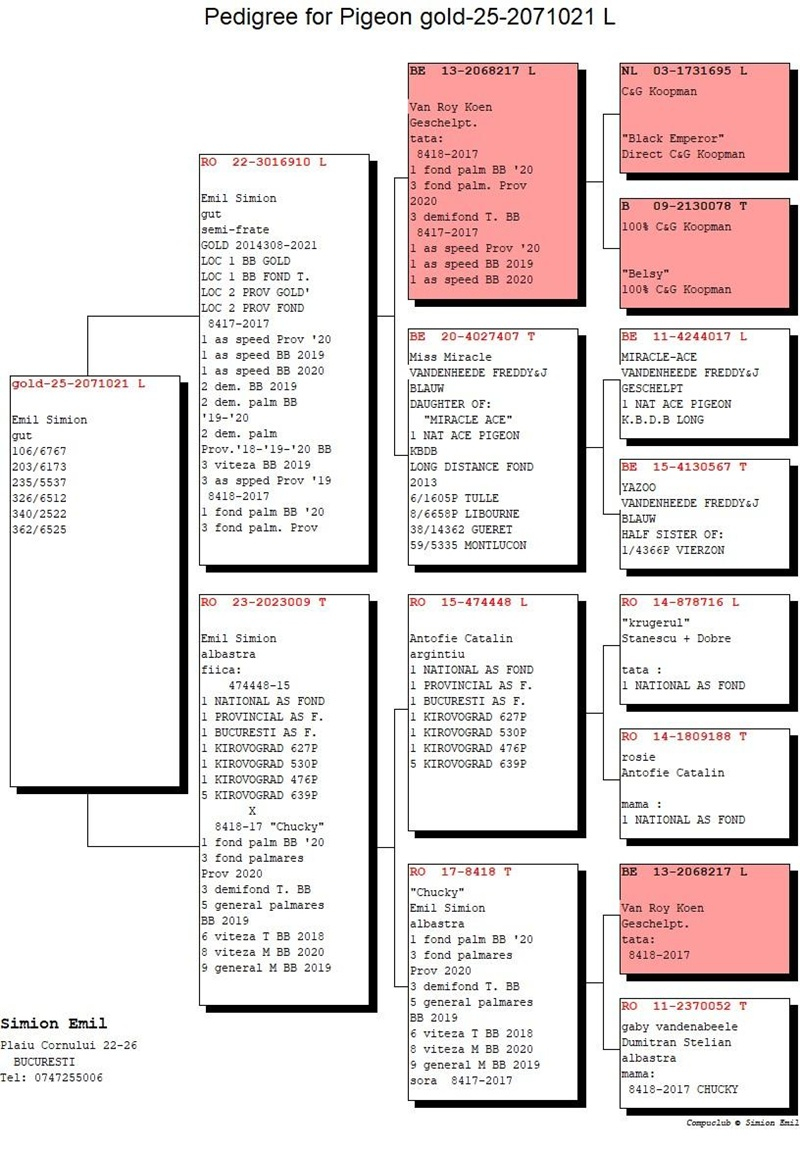 Porumbeii oferiți în această licitație provin din familii care au demonstrat în mod repetat capacitatea de a obține clasări fruntașe, dar și de a transmite aceste calități generațiilor următoare. Mulți dintre descendenți au confirmat în alte crescătorii, fapt care întărește valoarea reală a materialului genetic pus la dispoziție.