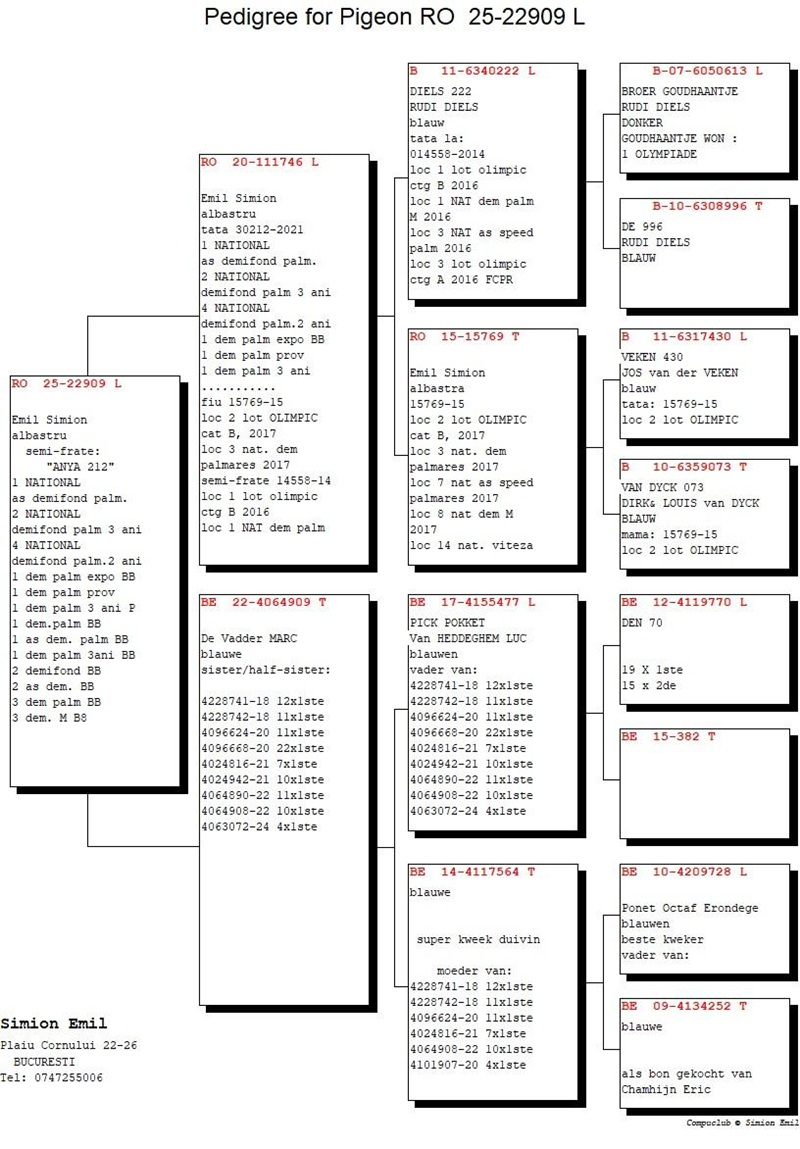 Porumbeii oferiți în această licitație provin din familii care au demonstrat în mod repetat capacitatea de a obține clasări fruntașe, dar și de a transmite aceste calități generațiilor următoare. Mulți dintre descendenți au confirmat în alte crescătorii, fapt care întărește valoarea reală a materialului genetic pus la dispoziție.