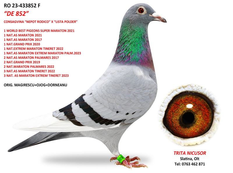 Vă invităm să participați la o licitație remarcabilă de porumbei de înaltă clasă, organizată de domnul Trita Nicușor, reputat columbofil din Slatina, județul Olt. Evenimentul constituie o oportunitate unică pentru pasionații de columbofilie de a achiziționa exemplare valoroase, provenind din linii genetice consacrate, aparținând unora dintre cei mai titrați campioni și vicecampioni ai renumitei crescătorii Trioul Magirescu + Ojog + Dorneanu. Printre numele de referință se regăsesc porumbeii legendari POWER NIGHT, TRIPLA CAMPIOANĂ NAȚIONALĂ, DE 004, DE 005, SUPER VELDEN, FAVORITUL și mulți alții.