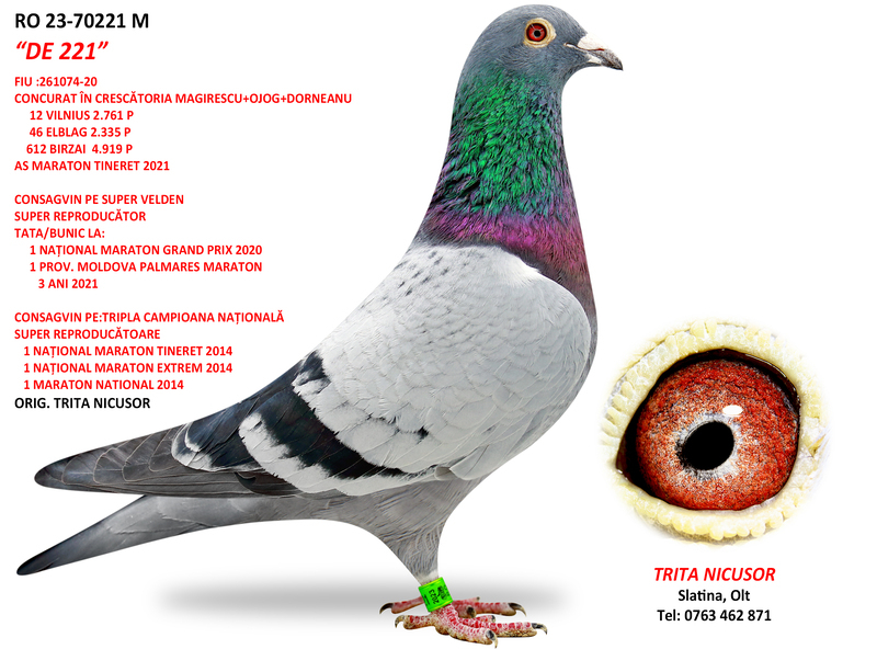 Vă invităm să participați la o licitație remarcabilă de porumbei de înaltă clasă, organizată de domnul Trita Nicușor, reputat columbofil din Slatina, județul Olt. Evenimentul constituie o oportunitate unică pentru pasionații de columbofilie de a achiziționa exemplare valoroase, provenind din linii genetice consacrate, aparținând unora dintre cei mai titrați campioni și vicecampioni ai renumitei crescătorii Trioul Magirescu + Ojog + Dorneanu. Printre numele de referință se regăsesc porumbeii legendari POWER NIGHT, TRIPLA CAMPIOANĂ NAȚIONALĂ, DE 004, DE 005, SUPER VELDEN, FAVORITUL și mulți alții.