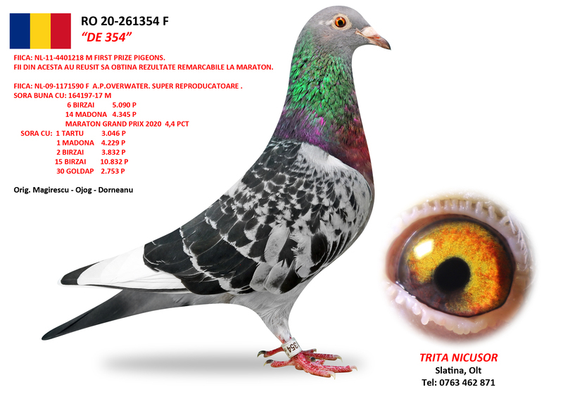 Vă invităm să participați la o licitație remarcabilă de porumbei de înaltă clasă, organizată de domnul Trita Nicușor, reputat columbofil din Slatina, județul Olt. Evenimentul constituie o oportunitate unică pentru pasionații de columbofilie de a achiziționa exemplare valoroase, provenind din linii genetice consacrate, aparținând unora dintre cei mai titrați campioni și vicecampioni ai renumitei crescătorii Trioul Magirescu + Ojog + Dorneanu. Printre numele de referință se regăsesc porumbeii legendari POWER NIGHT, TRIPLA CAMPIOANĂ NAȚIONALĂ, DE 004, DE 005, SUPER VELDEN, FAVORITUL și mulți alții.