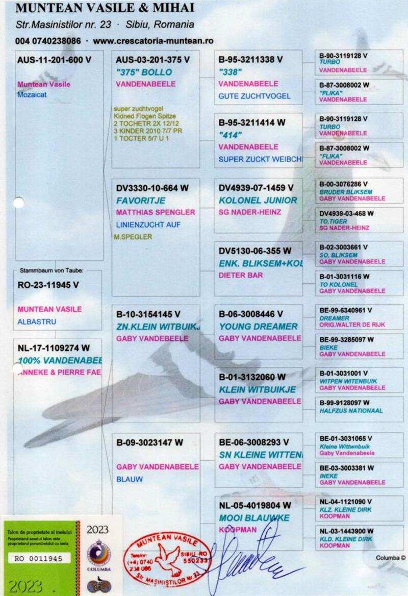 Având o abordare completă și reușind să concureze cu succes în cursele de la 100 la 1000 km, Vasile Muntean rămâne o figură de referință în istoria columbofiliei, datorită performanțelor sale remarcabile în cadrul celor mai importante concursuri de lungă distanță organizate în provincia Transilvania. Cei câțiva zeci de ani de experiență acumulată în columbofilie, împreună cu abilitățile sale de columbicultor și, în special, cu un bagaj genetic de excepție, au generat numeroase aprecieri pozitive din partea crescătorilor din întreaga țară și dincolo de granițele acesteia.