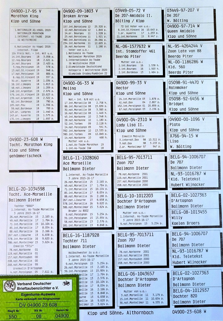 Porumbeii incluși în licitație provin din linii genetice consacrate, având ascendenți care au demonstrat performanțe remarcabile în competițiile de maraton, atât la nivel național, cât și internațional. Selecția exemplarelor s-a realizat riguros, având în vedere anduranța, rezistența și capacitatea de obținere a rezultatelor de vârf.