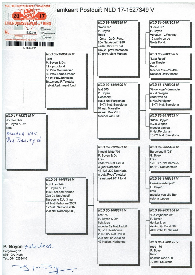 În columbofilia de maraton există crescătorii care nu impresionează prin volum, ci prin continuitate, durabilitate și rezultate obținute constant pe cele mai dure rute ale Europei. Piet Boyen & Fiica reprezintă exact această școală a excelenței: un efectiv restrâns, dar extrem de valoros, format prin selecție fără compromisuri și o viziune genetică clară, transmisă din generație în generație.
