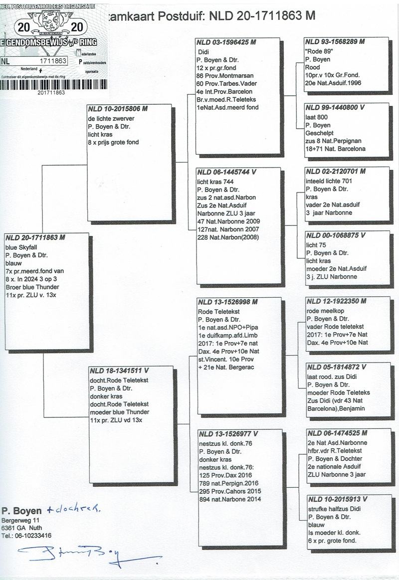 În columbofilia de maraton există crescătorii care nu impresionează prin volum, ci prin continuitate, durabilitate și rezultate obținute constant pe cele mai dure rute ale Europei. Piet Boyen & Fiica reprezintă exact această școală a excelenței: un efectiv restrâns, dar extrem de valoros, format prin selecție fără compromisuri și o viziune genetică clară, transmisă din generație în generație.